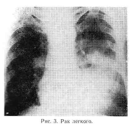 Следует обращать внимание на обнаруживаемые при рентгенологическом исследовании различные тени в легких (рис. 3). Тщательное рентгенологическое исследование является наиболее существенным моментом при диагностике рака легкого. Рентгенологическая картина определяется локализацией опухоли, особенностями ее роста, наличием осложнений, а также метастазов.