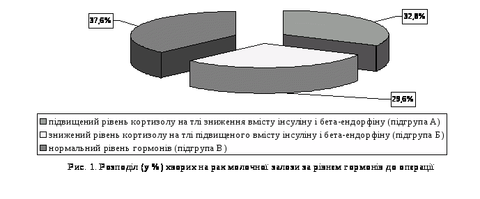У хворих на рак молочної залози в доопераційний період спостерігалось два варіанти гормональних дезадаптаційних розладів (62,4%): 1) при підвищеному рівні кортизолу відзначається зниження рівня інсуліну при суттєвому збільшенні коефіцієнта напруження, що свідчить про напруження компенсаторних механізмів (32,8%); 2) при низьких концентраціях кортизолу реєструється підвищений рівень інсуліну з низьким коефіцієнтом напруження, що характеризує виснаження адаптаційних можливостей організму (29,6%).