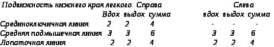 Нижние границы легких: справа (ребро) Слева (ребро)