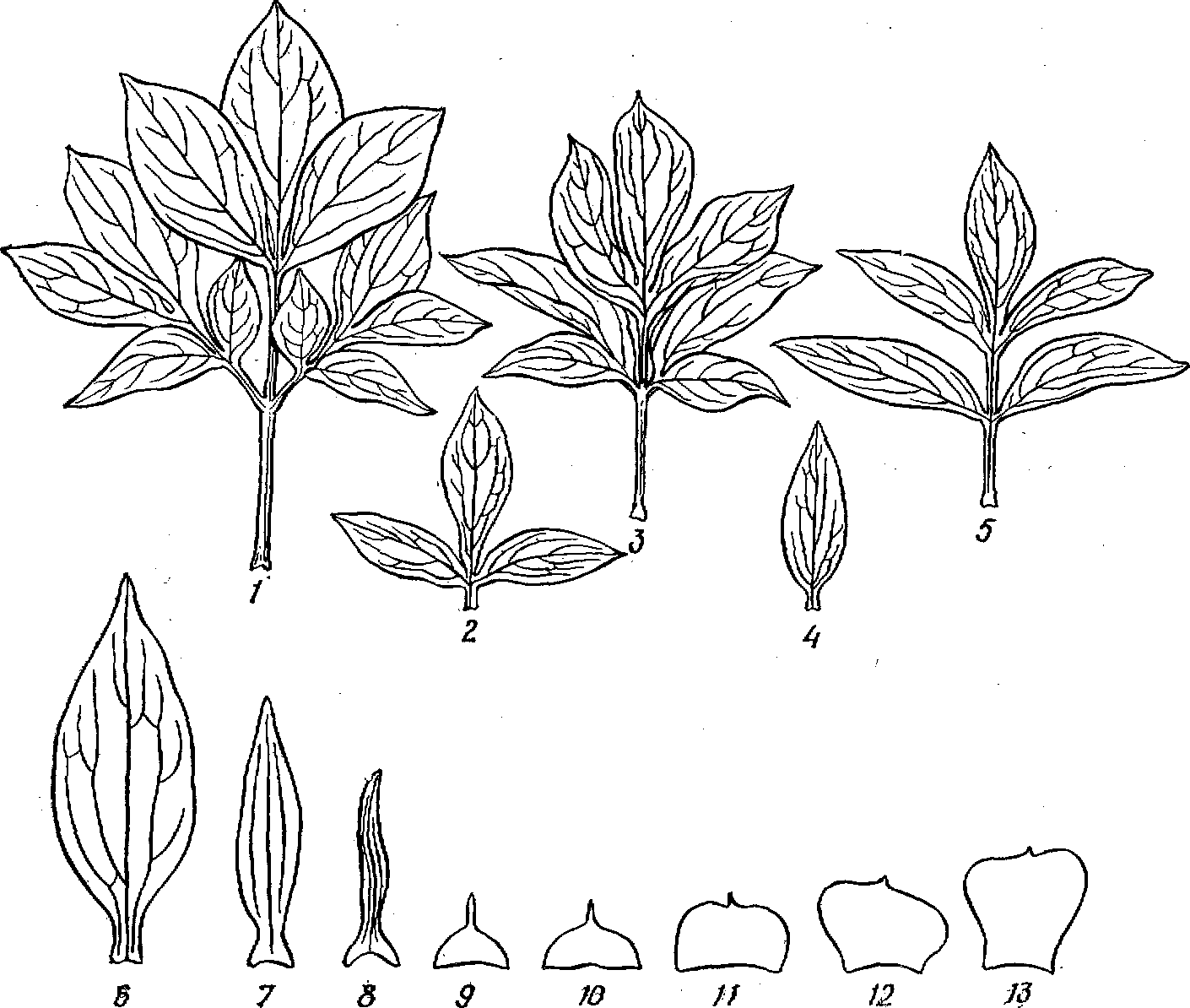 Рис. 274. Серия стеблевых листьев пиона (1—5} и верховые листья и чашелистики пиона (6—13}.
