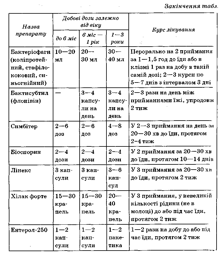 препарати з пробіотичними властивостями (бактисубтил, біфідум-ІЙКтерин, лактобактерин та ін.) і кисломолочні продукти («Біфівіт», іВіфілайф», біокефір, ацидофільно-дріжджове молоко, йогурти з жи-ІИМИбактеріями, «Симбітер»);