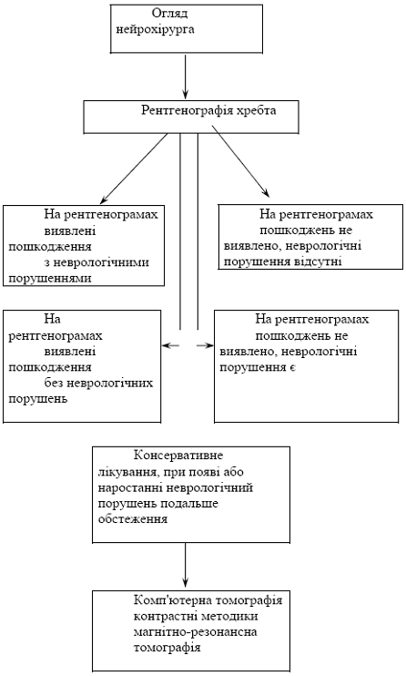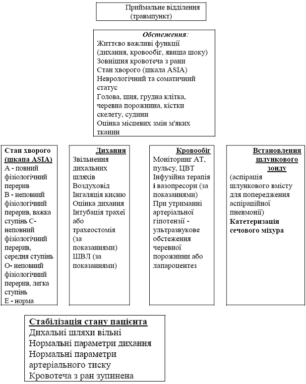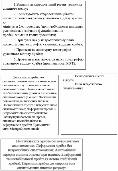 Надання допомоги потерпілим із травмою хребта відрізняється багатоетапністю: місце травми - медпункт (або бригада ШМД) - місцева лікарня - травматологічний центр. При такій багатоетапності належний обсяг надання допомоги не виконується, а в ряді випадків допомога не виявляється, що збільшує вагу стану хворого й значно знижує функціональні результати лікування травми.