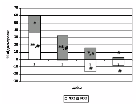 У зв’язку з тим, що NO розглядається як біфункціональна молекула, механізм дії якої залежить від умов, за яких вона синтезується (Манухина Е.Б. и др., 2002), нами було вивчено концентрацію його стабільних метаболітів. Формування ГСН в міокарді супроводжувалося підвищенням загального рівня NO>х> уже з першої доби: на 30,81 % (р<0,05), 49,04 % (р<0,001), 32,17 % (р<0,01) і 14,26 % відповідно діб спостереження.
