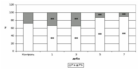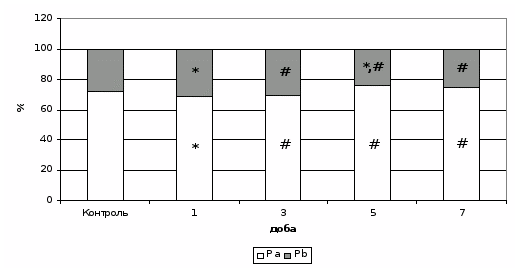 Рис. 7. Розподіл показників внутрішньо- (Ра) й позаклітинної (Рb) води в тканині міокарда при формуванні ГСН (%).