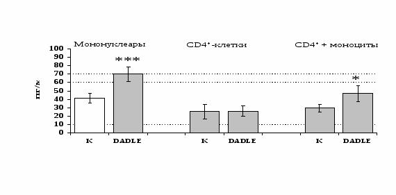 4. Впервые обнаружена зависимость стимулирующего эффекта опиоидных пептидов на пролиферацию лимфоцитов и продукцию IL-4 от присутствия моноцитов в клеточной культуре.