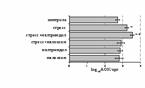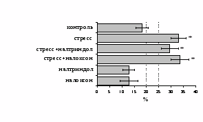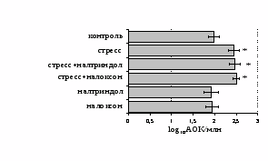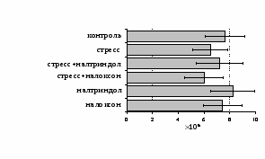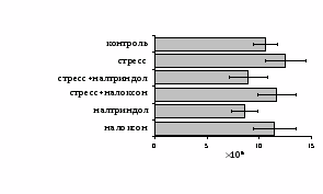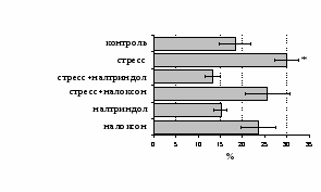 на фоне налоксона стимулирующий эффект ротационного стресса на антителогенез отменяется. Стрессиндуцированное усиление выраженности реакции ГЗТ отменяется как налоксоном, так и налтриндолом. Изолированное введение животным налтриндола или налоксона на количество АОК и степень выраженности ГЗТ влияния не оказывает. В эффекторную фазу иммунного ответа ротационный стресс (рис. 2) стимулирует как клеточный, так и гуморальный ответ, однако, в отличие от индуктивной фазы, на фоне блокады опиатных рецепторов эффекты стресса не модифицируются. Таким образом, стимуляция опиатных рецепторов в индуктивную фазу иммунного ответа играет важную роль в стрессиндуцированных изменениях иммуногенеза и ответственна за активацию функций иммунной системы при стрессе.