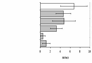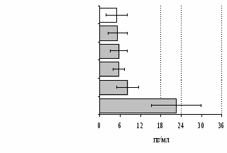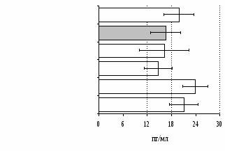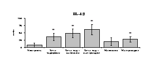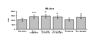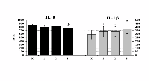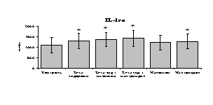 Рис. 21. Влияние -эндорфина 10-7М на продукцию IL-1 и IL-8 мононуклеарами, стимулированными ФГА 2,5 мкг/мл в течении 24 ч культивирования.
