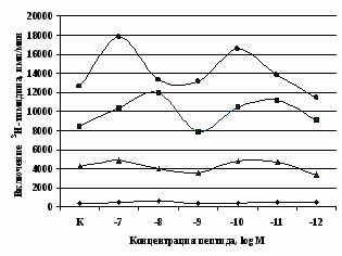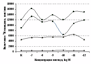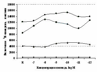 Пролиферативную активность оценивали по включению 3H-метилтимидина. Радиоактивность проб определяли на жидкостном сцинтилляционном счетчике Guardian (Wallac, Финляндия). Для определения концентрации IL-1β, TNF-, IL-6, IL-8, IL-1ra, IL-2, IL-4 и IFN-γ в супернатантах культур клеток использовали спектрофотометр Униплан (Пикон, Россия) и иммуноферментные тест-системы производства ООО Протеиновый контур, ООО Цитокин, Санкт-Петербург, Вектор-Бест, Новосибирск. В экспериментах in vitro использовали агонист δ,μ-опиатных рецепторов β-эндорфин в концентрациях 10-7-10-12М; меланотропин потенцирующий фактор (MPF) - фрагмент 88-91 β-липотропина (Lys-Lys-Gly-Glu) в концентрациях 10-7-10-12М; μ-агонист опиатных рецепторов DAGO (d-Ala2,N-Me-Phe4,Gly5-ol-энкефалин) в концентрациях 10-7– 10-12М; δ-агонист опиатных рецепторов DADLE (d–Ala2,d-Leu5-энкефалин) в концентрациях 10-7–10-12М; неселективный антагонист опиатных рецепторов налоксона гидрохлорид и селективный антагонист δ-рецепторов налтриндола гидрохлорид в концентрациях 10-6, 10-8, 10-10М; липополисахарид (ЛПС) Escherichia coli O26:B6 - 0,1 мкг/мл (Sigma, США), фитогемагглютинин (ФГА) – 1,25; 2,5; 5,0; 10,0; 20,0 мкг/мл (Sigma, США), диклофенак натрия (ДН) 25 мкг/мл, моноклональные анти-IL-1 антитела – 2 мкг/мл.