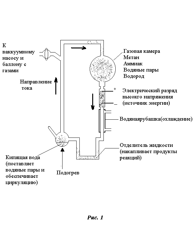 В 1953 г. Стэнли Миллер в ряде экспериментов моделировал условия, предположительно существовавшие на первобытной Земле. В созданной им установке (рис. 1) ему удалось синтезировать многие вещества, имеющие важное биологическое значение, в том числе ряд аминокислот, аденин и простые сахара, такие как рибоза. После этого Орджел в Институте Солка в сходном эксперименте синтезировал нуклеотидные цепи длиной в шесть мономерных единиц (простые нуклеиновые кислоты).
