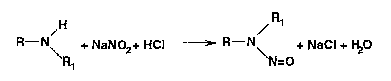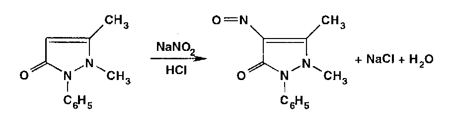 Взаимодействуя с антипирином (феназоном), нитриты образуют продукт замещения — нитрозоантипирин (зеленое окрашивание):