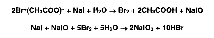 Для окисления образовавшихся йодидов до йодатов в колбу вносят раствор ацетата брома до появления желтого окрашивания: