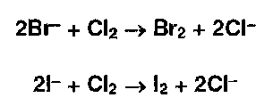 Выделившийся бром окрашивает слой хлороформа в оранжевый цвет, а йод — в фиолетовый. Йод обнаруживают также по синему окрашиванию крахмального клейстера.