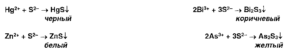 Ряд реактивов образуют белые или окрашенные осадки с несколькими катионами. Ионы ртути, цинка, висмута, мышьяка взаимодействуют с сульфидами: