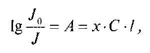 где/о — интенсивность излучения, падающего на вещество; /— интенсивность излучения, прошедшего через вещество; А — величина оптической плотности; х — показатель поглощения данного вещества; С — концентрация раствора анализируемого вещества, г; I — длина рабочего слоя кюветы, см.