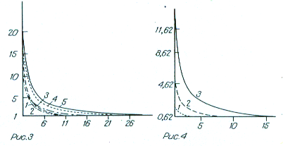 Рис. 3. Кривые динамики скорости фильтрации сывороток плацентарной крови человека через мембраны «Мифил». 1- «Дюрапор»; 2 — GS; З — «Мифил»; 4 — «Сарториус»; 5 — МФА-1. Здесь и на рис. 2 по оси абсцисс τ (в с), по оси ординат — υ(в мл). Рис. 4. Кривые динамики скорости фильтрации сывороток плацентарной крови человека через мембраны «Мифил». Концентрация сывороток: 1 — 100 %. 2 —20 %. Э — 10%.