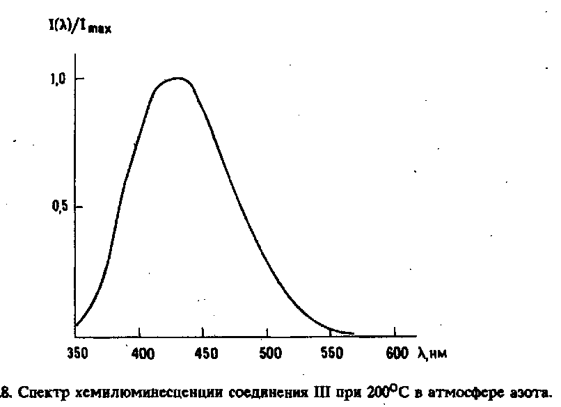 Не зависящий от концентрации спектр ТХЛ соединения III представлен на рис. 8. Максимум термохемилюминесценции находится при 425 ям. Спектр напоминает спектр флуоресценции адамантанона.