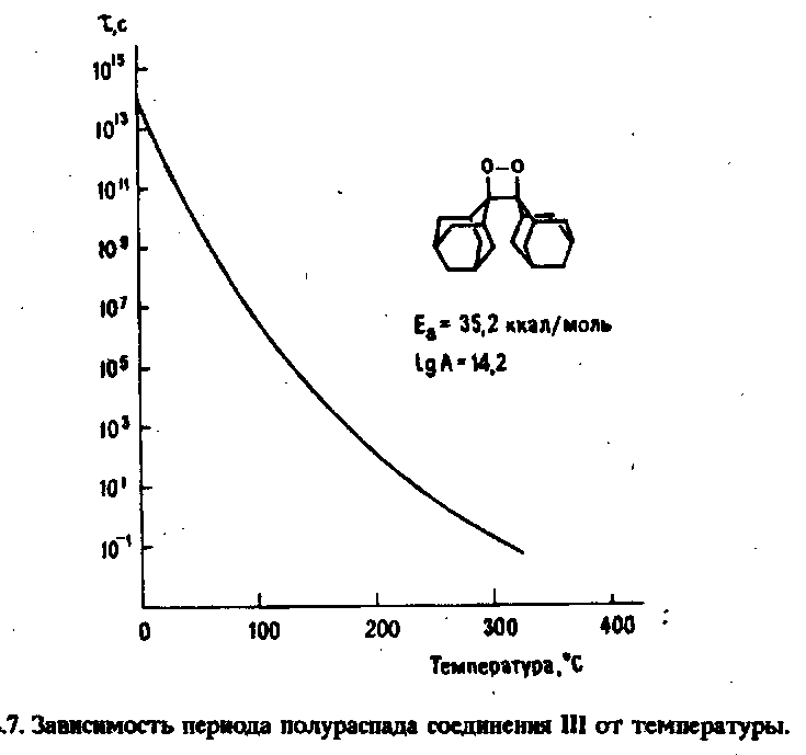 Энергия активации термического распада большинства 1,2-диоксетанов равна 20-26 ккал/моль. Это означает, что все такие соединения разлагаются в течение нескольких минут или самое большое нескольких недель при комнатной температуре. Поэтому такие соединения не могут выполнять роль хемилюминесцентных меток в аналитических методах in vitro. В нашей лаборатории в 1972 г. был синтезирован чрезвычайно стабильный 1,2-диоксетан, а именно адамантилиденадамантан-1,2-диоксетан. Это белое кристаллическое соединение может храниться при комнатной температуре в течение нескольких лет без разложения до адамантанона. Вычисленный период полураспада соединения III при 25°С равен 104 лет. Термическое разложение этого соединения протекает по первому порядку, и скорость хемилюминесцентной реакции не зависит от концентрации 1,2-диоксетана. При повышении температуры период полураспада уменьшается экспоненциально. График такой зависимости для соединения III представлен на рис.