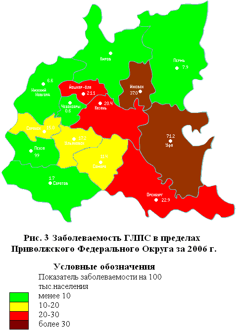 Наибольшее число заболевших ГЛПС, зарегистрировано в субъектах Приволжского Федерального Округа, на территории которых имеются стойкие природные очаги этой инфекции. В 2006 году в Приволжском федеральном округе заболело ГЛПС 6413 человек, они составили 89,1% от общего числа всех случаев заболеваний, имевших место в Российской Федерации. По сравнению с 2005 годом, заболеваемость ГЛПС по округу снизилась на 3,0% и составила 20,8 на 100 тыс. населения, что в 4,2 раза выше показателя заболеваемости в целом по Российской Федерации. [31]