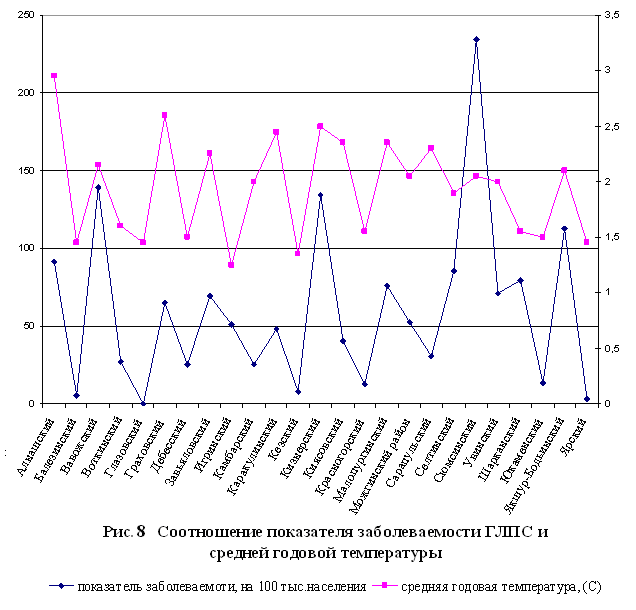 Климатические параметры, заметного влияния на заболеваемость непосредственно не оказывают, скорее всего, дело в том, что ландшафты исследуемой территории мало отличаются в климатическом аспекте вследствие небольшой их общей площади. В целом существует зависимость между среднегодовой температурой (точнее ранняя весна и поздняя осень) и численность РП (рис.9).