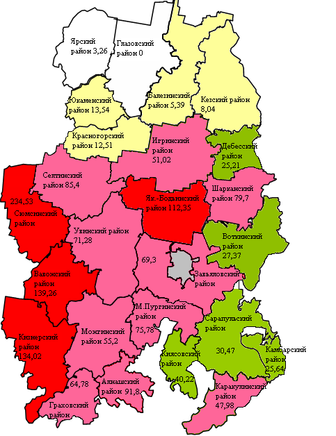 Районы с самым высоким средним за несколько лет показателем являются Сюмсинский, Увинский, Алнашский Завьяловский районы. Районы с единичными случаями заражения – Ярский и Глазовский.