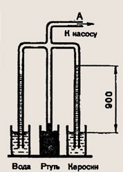 Через отверстие А (рис. 166) насос откачивает воздух. Почему при этом жидкости поднимаются по трубкам? Почему уровень керосина выше уровней воды и ртути? Высота столба керосина 90 см. Чему равны высоты столбов воды и ртути?