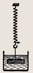 Стальной брусок подвешен к пружине и опущен в воду (рис. 190). С одинаковой ли силой давит вода на верхнюю и нижнюю поверхности бруска? Ответ обоснуйте.