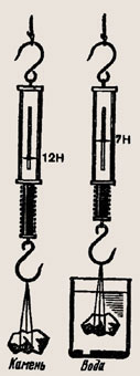 Стальной брусок, вес которого 15,6 Н, погрузили в воду (рис. 190). Определите значение и направление силы натяжения пружины.