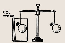 На коромысле весов уравновесили два одинаковых сосуда. Нарушится ли равновесие весов, если один сосуд поместить в открытую банку и заполнить ее углекислым газом (рис. 195)?