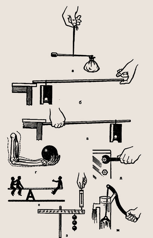 На рисунке 204 у каждого рычага найдите точку опоры (ось вращения) и плечи. Определите направление сил, действующих на эти рычаги.