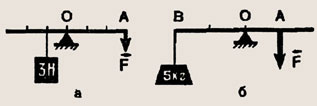 Какую силу нужно приложить к рычагу в точке А, чтобы уравновесить груз (рис. 206, а, б)?