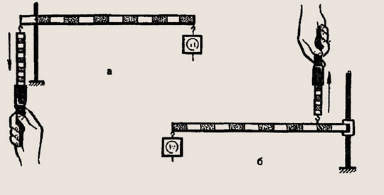 Определите цену деления динамометров (рис. 214, а, б), если рычаги с подвешенными к их концам грузами по 10 Н каждый находятся в равновесии. (Весом рычагов пренебречь.)
