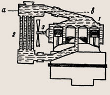На рисунке 262 изображена упрощенная схема водяного охлаждения двигателя трактора, которая состоит из рубашки двигателя 1, радиатора 2, трубопровода и вентилятора 3. Объясните, как осуществляется охлаждение цилиндров двигателя. Что произойдет, если уровень воды в системе охлаждения опустится ниже патрубка верхнего бачка радиатора (уровень ав)?