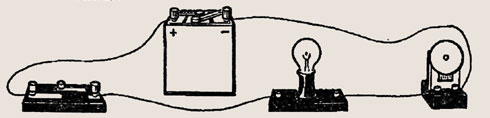 Рассмотрите электрическую установку, изображенную на рисунке 299. Что в ней является источником тока, а что приемниками электрической энергии? Каково направление тока в проводнике, соединяющем лампу со звонком, когда ключ замкнут?