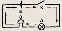 Рассмотрите схему электрической цепи, изображенную на рисунке 300. Назовите составные части цепи, обозначенные буквами Е, К, Л, 3. Что обозначают стрелки на схеме? Каково истинное направление движения зарядов в цепи?