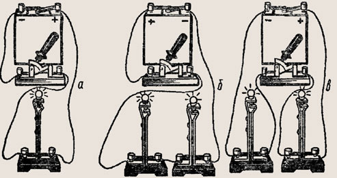 Укажите направление тока в проводах, подведенных к лампе, в установке, изображенной на рисунке 298.