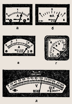 На рисунке 308 изображены шкалы электроизмерительных приборов. Как называются эти приборы? Каковы пределы измерения приборов? Какова цена деления шкалы каждого прибора? Каковы их показания?