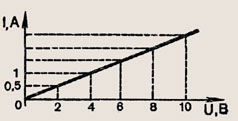 По графику зависимости силы тока в проводнике от напряжения (рис. 310) определите, чему равна сила тока в проводнике при напряжении 2; 1; 5; 6; 10 В.
