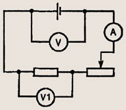 При показании вольтметра F(CM. рис. 321), равном 4,5 В, показание вольтметра VI равно 1,5 В. Каково показание амперметра, если сопротивление реостата составляет 20 Ом?