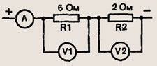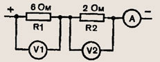 Вольтметр V1показывает 12 В (рис. 327). Каковы показания амперметра и вольтметра V2?