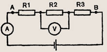 В цепь включены последовательно три проводника сопротивлениями: R1=5 Ом, R2=6 Ом, R3=12 Ом (рис. 329). Какую силу тока показывает амперметр и каково напряжение между точками Аи В, если показание вольтметра 1,2 В?