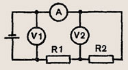 В цепь включены два проводника:R1 =5 Ом и R2 = 10 Ом (рис. 330). Вольтметр V1 показывает напряжение 12 В. Определите показания амперметра и вольтметра V2.