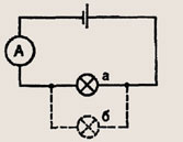 Амперметр, включенный в цепь, состоящую из источника тока и электрической лампы а, показывает некоторую силу тока. Как изменится показание амперметра, если в эту цепь включить еще одну лампу б (рис. 341)?