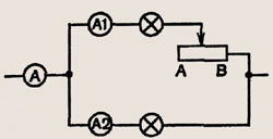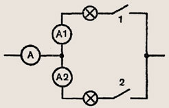 В цепь (рис. 342) включены две одинаковые лампы. При замкнутых выключателях 1 и 2 амперметр А показывает силу тока 3 А. Что покажет амперметр А2, если выключатель1 разомкнуть? (В цепи постоянное напряжение.)