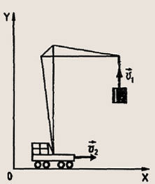 Скорость и, вертикального подъема груза краном равна 0,2 м/с. Скорость v2 тележки крана равна 0,1 м/с (рис. 27). Определите скорость движения груза относительно наблюдателя, неподвижно стоящего на поверхности Земли.