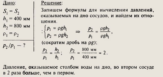 1. Больше налито воды в левый сосуд, так как его объем больше.
