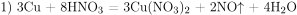 Медь растворили в разбавленной азотной кислоте. Выделившийся бесцветный газ собрали в колбе и добавили в неё газ, выделившийся при прокаливании перманганата калия. Образовавшийся в колбе газ пропустили через раствор щёлочи. Напишите уравнения четырёх описанных реакций.