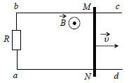 По параллельным проводникам bc и ad, находящимся в магнитном поле с индукцией В = 0,4 Тл, скользит проводящий стержень MN, который находится в контакте с проводниками (см. рисунок). Расстояние между проводниками l = 20 см. Слева проводники замкнуты резистором с сопротивлением R = 2 Ом. Сопротивление стержня и проводников пренебрежимо мало. При движении стержня через резистор R протекает ток I = 40 мА. С какой скоростью движется проводник? Считать, что вектор B перпендикулярен плоскости рисунка.