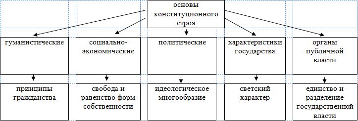 идеологическое многообразие, характеристики государства, единство и разделение государственной власти, политические, органы публичной власти, социально-экономические, принципы гражданства, светский характер, свобода и равенство форм собственности, гуманистические.